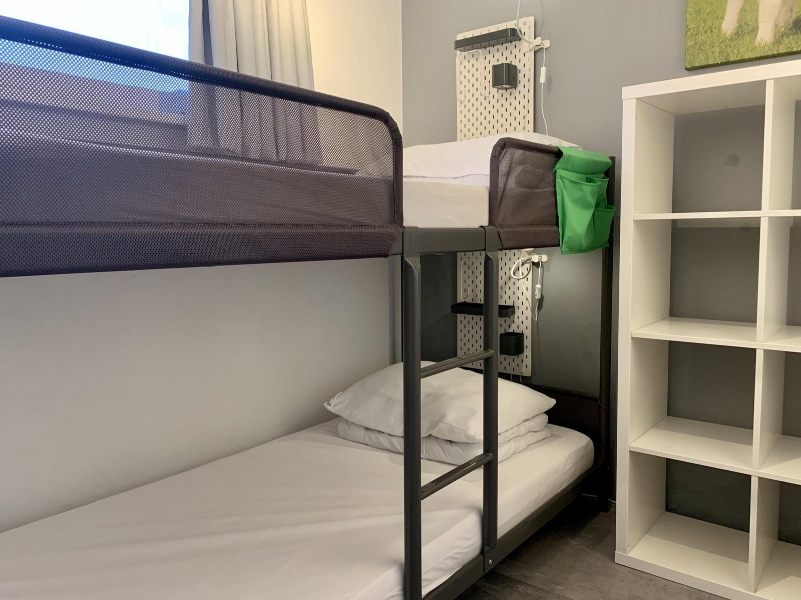 Originally, there were 3 somewhat smaller bedrooms in the bungalow. The owners have sacrificed a bedroom, creating 2 larger bedrooms. There is one bedroom with a double box-spring bed (160 x 200) and one bedroom with a bunk bed (90 x 200). All beds have duvets and pillows.